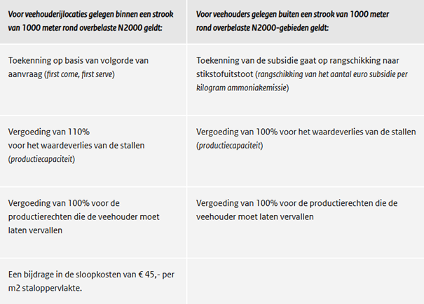 De bedrijven die zich aanmelden worden in twee rondes beoordeeld. Veehouderijlocaties binnen een strook van 1 kilometer rondom overbelaste natura2000gebieden kunnen namelijk met voorrang aanspraak maken op de subsidie. Als er daarna nog budget over is, kunnen ook veehouderijlocaties buiten deze strook aanspraak maken op de subsidie. De vergoeding is echter wel lager.